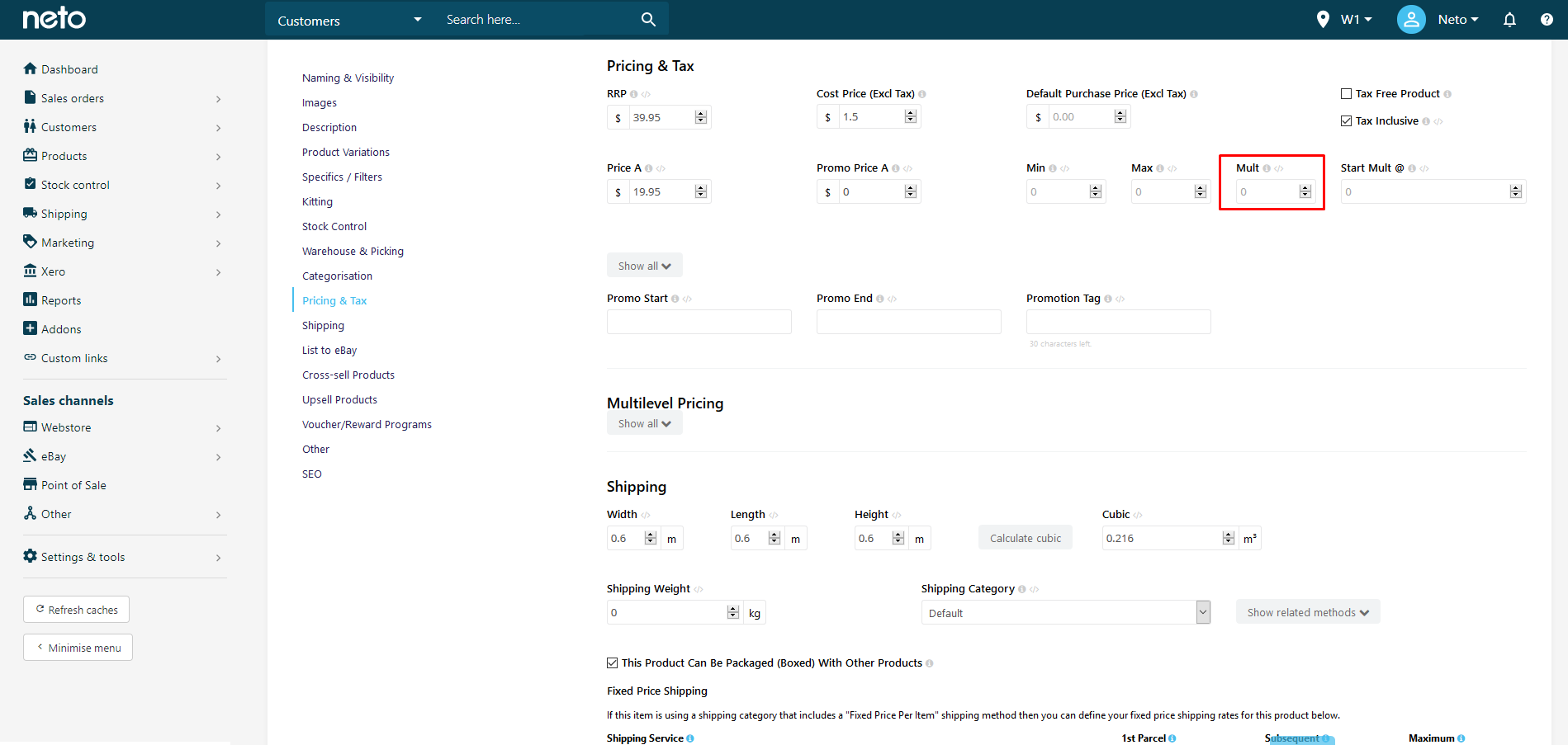 - Click the Pricing & Tax tab. In this section you will see a field labelled Mult. This is where you define your multiplier quantity.
