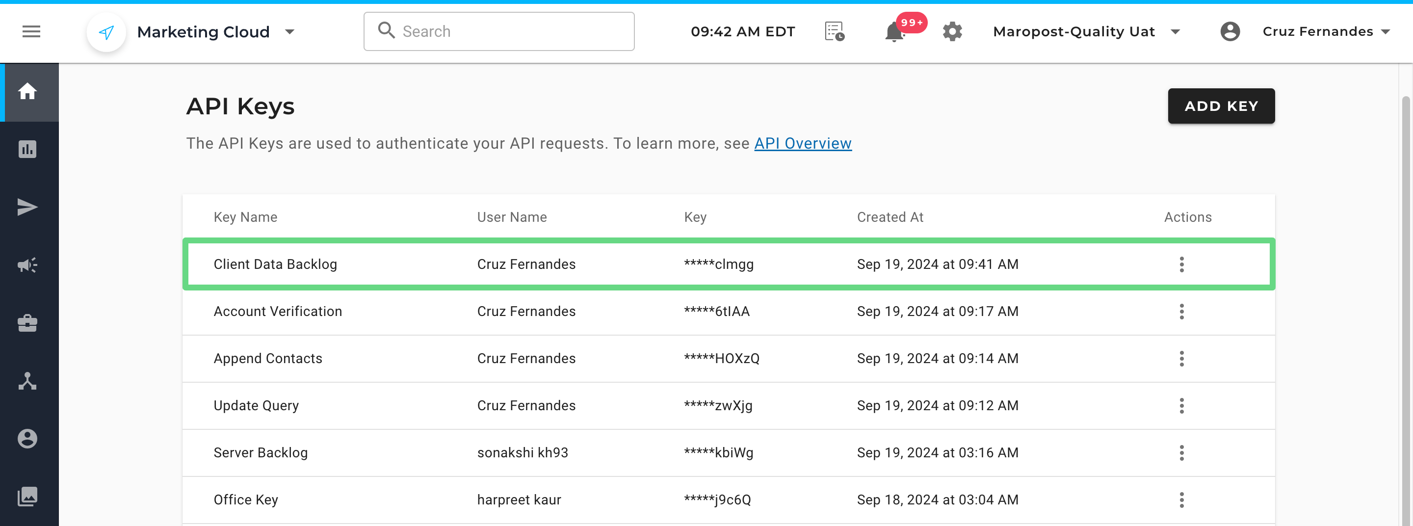 Maropost allows multiple API keys to be added per account. Once created, all keys can be viewed on the index page, displaying their names, masked keys, and creation dates, with the most recently created keys listed first.